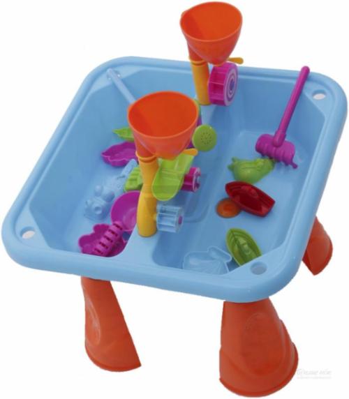 В одной части стола имеется отделение для песка, а в другой - для воды. В комплекте малыши найдут водяные колеса, лейки, лодки, а также формочки и совки - все для увлекательного отдыха на свежем воздухе или в помещении.