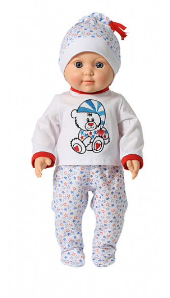 Пупс одет в водолазку, ползунки и шапочку. Водолазка с вышивкой на груди, длинным рукавом и воротником стойкой, с застежкой сзади на контактную ленту.