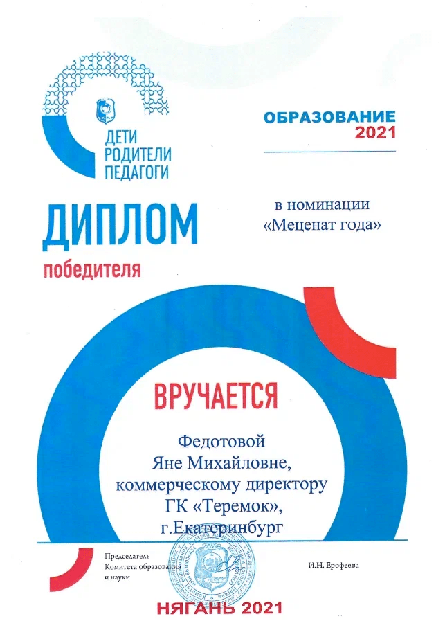 Диплом победителя в номинации "Меценат года" Нягань 2021 врученный коммерческому директору ГК "Теремок" Федотовой Яне Михайловне