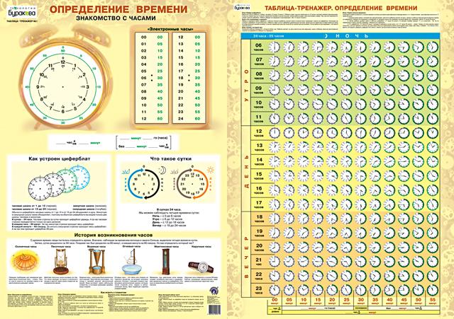 Одна сторона плаката знакомит ребенка с циферблатом, а другая служит своеобразным тренажером.