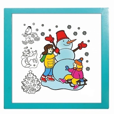 Комплект состоит из рамы, безопасного стекла, 1 листа- раскраски, набора фломастеров и специальной губки, которой легко стирать написанное. Раскраску можно использовать и дома, и в детском саду.